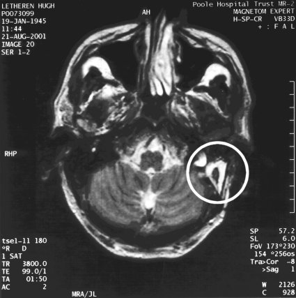 I had another MRI scan about 28 months after the operation to check on an unrelated problem, which proved to be clear. However, it clearly shows the area of my head which was excavated and filled with fat from my abdomen. This scan is similar to the one above but taken at a greater tilt to the horizontal, so it is difficult to make direct comparisons.